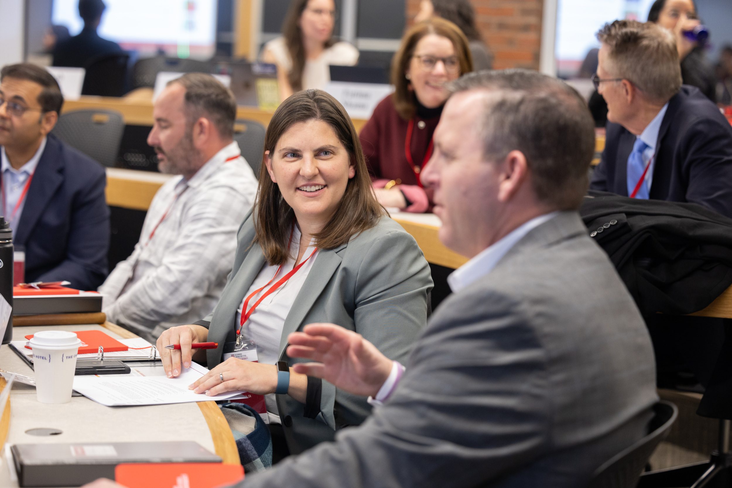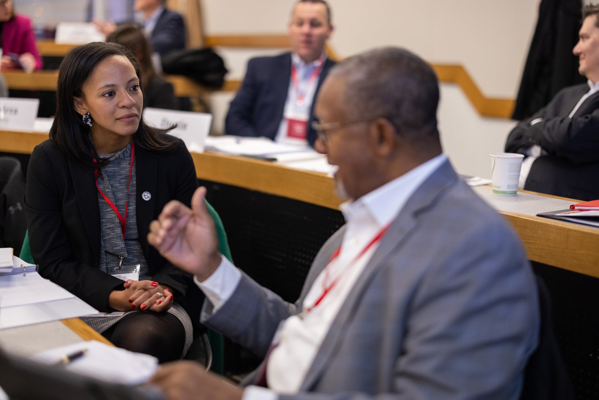 Alexandria, Virginia Mayor Alyia Gaskins (left) and Hampton, Virginia Mayor Jimmy Gray exchange insights during a classroom session of the Program for New Mayors in December 2024.